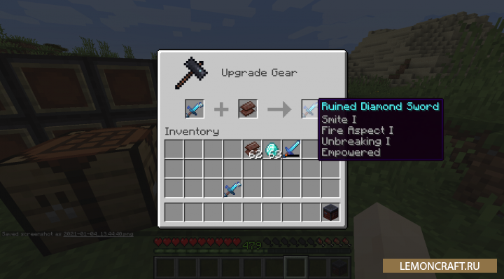 Мод на сломанные предметы Ruined Equipment делает предметы имеющие нулевую прочность разрушенными или дает вам возможность отремонтировать их. Так же вы сможете увековечить данные предметы любым удобным вам способом.